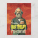 Karl Marx with a twist ! karl Marx sitting at a birthday party table, blowing out candles on a cake with the words, "Happy Birthday, Proletariat! Let's share the cake...and the means of production!"