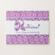 Lettre personnalisée K nom monogramme et sens puzzle. Jolie lettre initiale dessinée à la main K nom monogramme et signifiant filles scie en violet, rose et blanc. Idéal pour un cadeau personnalisé pour une fille qui a un nom qui commence par la lettre K. Cet exemple lit Katrina Pure. Une précieuse beauté tendre ou vous pouvez customiser le texte avec votre propre nom et message ou mots. Fait un anniversaire de fille unique, ou cadeau de vacances. © Lettre typographique K fleurs et coeurs dessin à la main et motif unique créé par Sarah Trett. www.sarahtrett.com pour www.mylittleeden.com