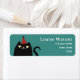 Cute, funny, cartoon, kawaii black cat with party hat colourful return address label for kids birthdays.