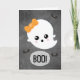 A kawaii Halloween card featuring a big-eyed ghost with an orange bow, bats, and bold “Boo!” text on a dark background. A playful way to send Halloween cheer to friends, family, or coworkers — perfect for kids!