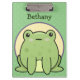 Adorable kawaii green frog with a slight blush on his cheeks in a yellow circle on a green background that has a tiny white polka dot pattern on it. Above is a template to add your name or other personal message. The back has a pattern of lots of the same frog with green leaves.