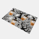 An adorable kawaii kitty dressed as a witch, holding an orange pumpkin, as she goes trick or treating in a spooky graveyard surrounded by ghosts and bats.