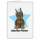 Buy cute red Doberman Pinscher gifts, drawn in a Japanese cartoon style known as kawaii. The alert dog breed is sitting in the middle of a large aqua star, with the breed name printed underneath. On a large assortment of red Doberman Pinscher merchandise for dog lovers. The black and tan coat is also available.