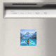 Magnet with an illustration of a man kayaking in the ocean by the snow topped mountains. Pretty serene blue tranquil water and pine trees surround him on a peaceful journey.