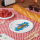 A kayaking design of an orange kayak in the water. This design looks really effective on these Paper Plates