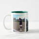 This is a two-tone coffee mug with three different pictures of the Keeneland race track in Lexington, Kentucky.