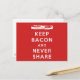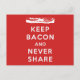 Keep Bacon And Never Share. Devour rashers of bacon calmly? NEVER! Mine, mine, mine! Based on the World War Two Poster, "KEEP CALM AND CARRY ON". White text and image over a red background. “KEEP BACON AND NEVER SHARE”.