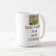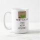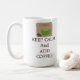 Keep calm and add coffee...enough said. Cute coffee sign with a mug of steaming hot coffee and a few loose coffee beans.