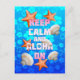 Keep Calm And Aloha On with starfish and seashells. Aloha means more the a greeting, farewell, or love. Aloha On refers to the Hawaiian Aloha Spirit, respecting nature and the natural world. Ocean blue background of Hawaiian Hibiscus flowers and Hawaiian Honu sea turtles.