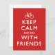 Keep Calm and Bike with Friends. A fun and fitness-oriented variation of the WW2 poster "Keep Calm and Carry On". A white image of a bicycle with white text over red. A happy birthday cyclist funny and cute invitation to cycle with friends!