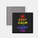Keep Calm and Carry On vintage-style design in a rainbow of colours against a black background.