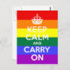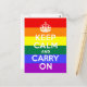 Keep Calm and Carry On vintage-style design against a rainbow design.