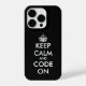 Keep calm and code on custom iPhone 14 pro Case. Make your own personalized keep calm meme quote. Black or custom background colour. Funny template design with modern typography and crown.