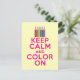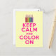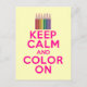 Keep calm and colour on. Relax by colouring with crayons, colour pencils and pastels. Pink keep calm font over a light yellow background with a set of coloured pencils at the top. Post card for art teachers!