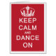 The "Keep Calm and Dance On" design in red has people partying on a dance floor in front of big speakers and disco ball in the shape of the crown of the classic "Keep Calm and Carry On" posters.