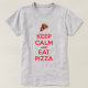 Keep Calm and Eat Pizza design featuring a cartoon pizza slice and bright red typography. Perfect for pizza lovers and foodies who love funny pizza quotes. Great for tees, posters or gifts.