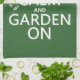 This reads Keep Calm and Garden On, in the style of the classic keep calm poster. Leaves are growing from the letters. It's a beautiful simple design which makes a beautiful range of products for the gardener in your life.