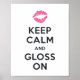 Our take on the classic WWII slogan for beauty and makeup lovers features "keep calm and gloss on" topped by a vibrant pink lip print kiss illustration, for a cute addition to your bathroom or vanity.