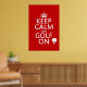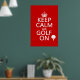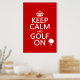 This is the classic Keep Calm poster reworded to 'Keep Calm and Golf On'.  There is a silhouette of a golf ball on a tee next to the letters.  It's a striking design, popular with everyone who loves golf.  Available on a wide range of products, from towels to storage jars, to travel tags.  It makes great gifts for golfers and golf fans.