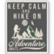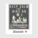 This Sticker is perfect for a hiking enthusiast. Show how much you love hiking by decorating your car, computer, water bottle etc. with this fun sticker. The design features the words "Keep Calm And Hike On", and "Adventure Awaits" with a silhouette of a hiker, mountain, trees, sun, bird and grass between the words. This will make a great gift for a hiker. Design made in Kittl.