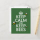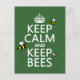 This reads Keep Calm and Keep Bees. Cartoon bees buzz alongside the words. It's a beautiful design, really popular with anyone interested in beekeeping and bee conservation.