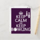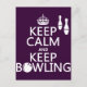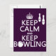 This reads Keep Calm and Keep Bowling, in the style of the classic keep calm poster. There is a bowling ball in place of the O in the final word, and two bowling pins at the top. It's a fun design, loved by everyone who loves to bowl.