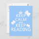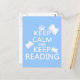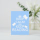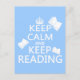 This is the classic war poster "Keep Calm and Carry On" reworded to "Keep Calm and Keep Reading". It's written in white on a coloured background and is accompanied by the silhouettes of three falling books.
