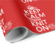 This reads Keep Calm and Knit On, in the style of the classic keep calm poster. There are balls of yarn and knitting needles nestling among the words. It's a beautiful design, which will please anyone who loves to knit. It makes a great range of presents for knitters, and home furnishings for crafting / sewing rooms.