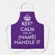 Keep calm and let (name) handle it funny purple BBQ apron for men and women. Modern typography template with crown. Personalized kitchen cooking aprons in any colour. Trendy template with big letter typography design. Add your own name or humourous quote. Create your own one of a kind Birthday party gift for grill master, mom, dad, sister, brother, father, mother, wife, husband, friend, uncle, aunt, boyfriend, girlfriend, grandma, grandpa, kids, boss, co worker, chef, cook, colleague, coach, teacher, nurse, wedding couple etc. Available in small, medium and large size. Also great for dinner party, baking, dish washing, art & crafts work etc. Make a his and hers for him and her. Humour presents for friends and family.