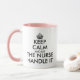 Keep calm and let the nurse handle it coffee mug. Make your own funny Keep Calm and Carry On parody for RN nurses, nurses week, nursing school graduation and more. Modern typography template with crown. Double sided print. Nursing humour. Combo colour cup with pink handle and inside. Custom design with text and crown in any colour.
