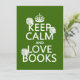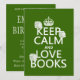 This reads Keep Calm and Love Books, in the style of the classic keep calm poster. It is decorated with small piles of books sitting on the letters. It's a beautiful and popular design, which is loved by everyone who loves books, whether a reader or writer. It's available on a wide range of products, making wonderful gifts for book sellers, librarians, writers and anyone who reads.
