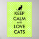 Keep calm and love cats poster | green and white polka dots pattern. Customizable with your text and background colour. ie green and white. Keep calm and carry on design parody. Funny spoof with silhouette for black cat.
