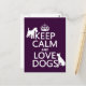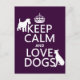 This reads Keep Calm and Keep Calm and Love Dogs, in the style of the classic Keep Calm poster. There are two silhouettes of dogs sitting by the words. It's a fun beautiful design perfect for everyone who loves dogs.