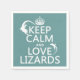 This reads Keep Calm and Love Lizards, in the style of the classic poster. It is decorated with the silhouettes of two lizards crawling beside the words. It's a great clean design, and a perfect gift for anyone who loves lizards.