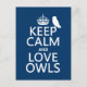 The design reads Keep Calm and Love Owls, in the style of the classic poster. There is a beautiful wise owl sitting on the words. It's a stylish design which makes a great range of presents for anyone who loves or works with owls.