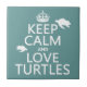 This reads Keep Calm and Love Turtles. Two silhouette turtles swim beside the letters. It's a clean and beautiful design, perfect for anyone you know who just loves turtles.