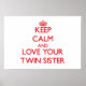 Use the search tool at my store to find other Twin Sister merchandise. Keep Calm and Love your Twin Sister products available on tshirts,sweatshirts,kids shirts, infant onsies, stickers, magnets, and much more Twin Sister clothing fully customizable to your specifications. If you like what you see, please link to my store (www.zazzle.com/familygiftshirts) or email a friend.