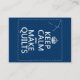 This reads Keep Calm and Make Quilts, in the style of the classic keep calm poster. It's just as good advice as the original in times of stress. There is a line of 'stitching' around the outside of the design, and a needle pierced in the corner. It's a beautiful design, which will thrill anyone who loves to quilt.