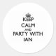 Use the search tool at my store to find other Ian merchandise. Keep Calm and Party with Ian products avaiable on tshirts,sweatshirts,kids shirts, infant onsies, stickers, magnets, and much more Ian clothing fully customizable to your specifcations. If you like what you see, please link to my store (www.zazzle.com/nameshirt) or email a friend.