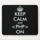 Keep Calm and PHP on Mousepad | Geeky humour for programmers and coders. Create your own funny Keep calm and carry on parody. For example with html php java javascript perl sql. Customize background colours and text the way you want it.