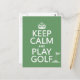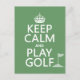 This is the traditional poster reworded to 'Keep Calm and Play Golf'. Excellent words to live by! There is a small flag next to the words. It's a popular design, loved by golfers and golf fans. Available on a wide range of products, it makes great gifts and giveaways for golf enthusiasts.