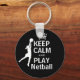 Customizable, keep calm and play netball keyring with love heart stick figure positions. Fun gift idea for netball player or fan.