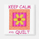 Show off your love of quilting with this fun and colourful quilt block proclaiming "Keep Calm and Quilt". This design is original quilt art with a colourful appliqué flower patchwork block. The word "quilt" is easy to change to another word of your choice. The quilt design is in vibrant and dynamic colours of orange, yellow and pink for a beautiful colour palette. Fully customizable to personalize. Quilt art is original art from fabric and quilt designer Phyllis Dobbs. This art is available on other products and in several colour backgrounds and is also available on more Keep Calm products with different quilt art. More products are available in Phyllis' BusinessWithFlair store.