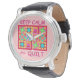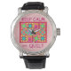 Show off your love of quilting with this fun and colourful quilt block wrist watch proclaiming "Keep Calm and Quilt" on a coral pink background. This design is original quilt art and favourite patchwork quilt blocks plus unique blocks including log cabin, pinwheel, star, and square in a square blocks. The word "quilt" is easy to change to another word of your choice. The quilt design is in vibrant and dynamic colours of orange, yellow, pink, turquoise, and lime green for a beautiful colour palette. Fully customizable to personalize. Quilt art is original art from fabric and quilt designer Phyllis Dobbs. This art is available on other products and in several colour backgrounds and is also available on more Keep Calm products with different quilt art. More products are available in Phyllis' BusinessWithFlair store.