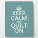 This reads Keep Calm and Quilt On, in the style of the classic keep calm poster. There is a needle piercing the letters, with thread dangling. It's a whimsical beautiful design which appeals to everyone who loves to quilt.