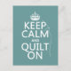 This reads Keep Calm and Quilt On, in the style of the classic keep calm poster. There is a needle piercing the letters, with thread dangling. It's a whimsical beautiful design which appeals to everyone who loves to quilt.