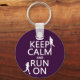 This design reads 'Keep Calm and Run On' in the style of the classic keep calm poster, including the crown at the top. There are silhouettes of two figures running over the letters. Great as gifts or treats for anyone who is in training or loves to run. Great presents for coaches and trainers.