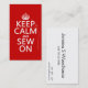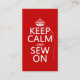 This reads Keep Calm and Sew On, in the style of the classic keep calm poster. There is a needle 'pierced' through the letters, and thread dangling from it. it's a nice touch in a simple and classic design, which will appeal to everyone who loves to sew, whether professional or amateur. Great for sewing circles, and sewing lessons.