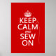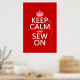 This reads Keep Calm and Sew On, in the style of the classic keep calm poster. There is a needle 'pierced' through the letters, and thread dangling from it. it's a nice touch in a simple and classic design, which will appeal to everyone who loves to sew, whether professional or amateur. Great for sewing circles, and sewing lessons.