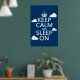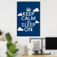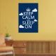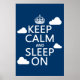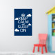 This reads Keep Calm and Sleep On, in the style of the classic keep calm poster. There are clouds floating past the words. It's a popular, calming design, perfect design for the bedroom, or for anyone involved in sleep therapy.